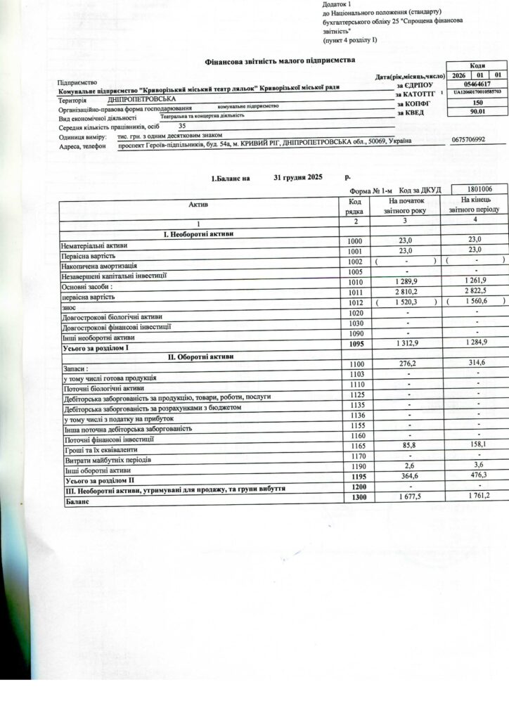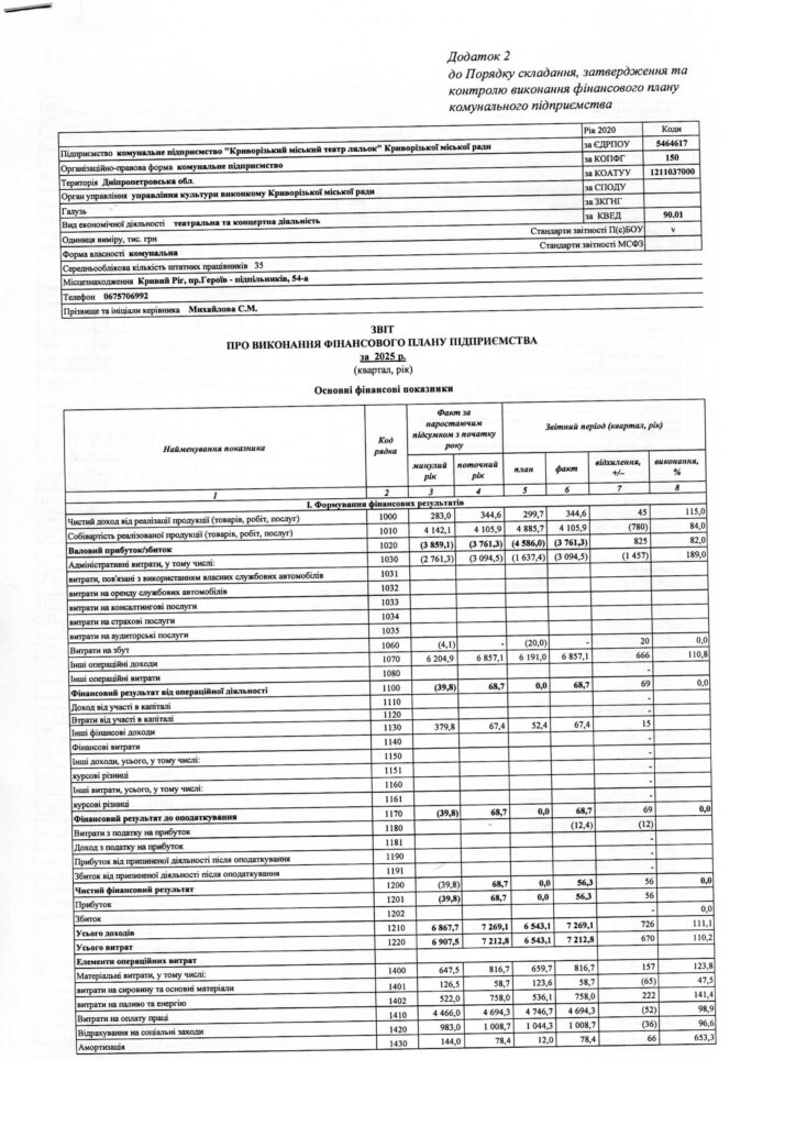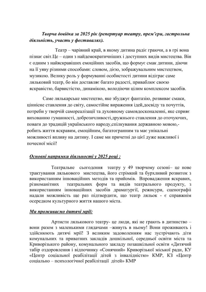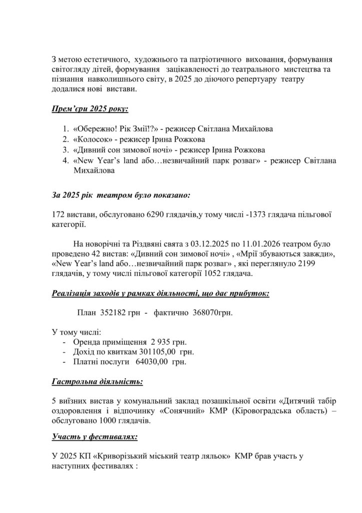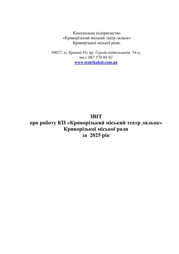 Звіт керівника комунального підприємства «Криворізький міський театр ляльок» Криворізької міської ради за 2019 рік