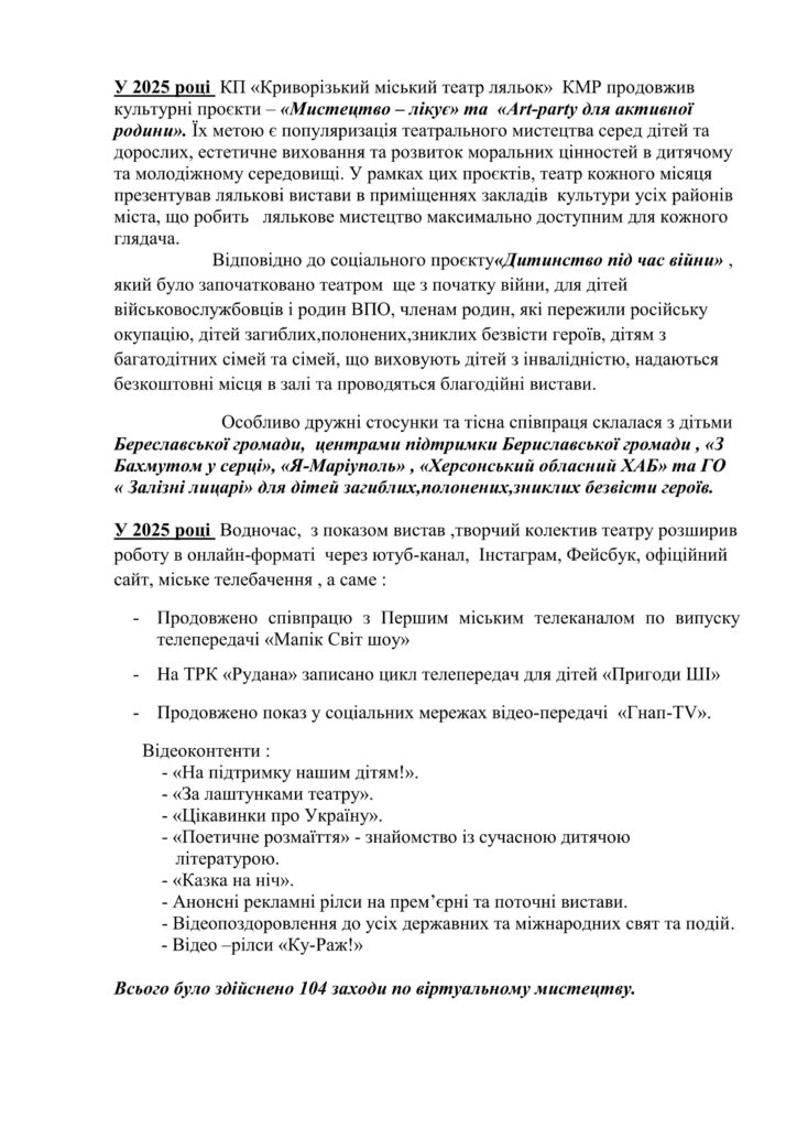 ТА КОНЦЕРТНА ДІЯЛЬНІСТЬ» КП «Криворізький міський театр ляльок» КМР